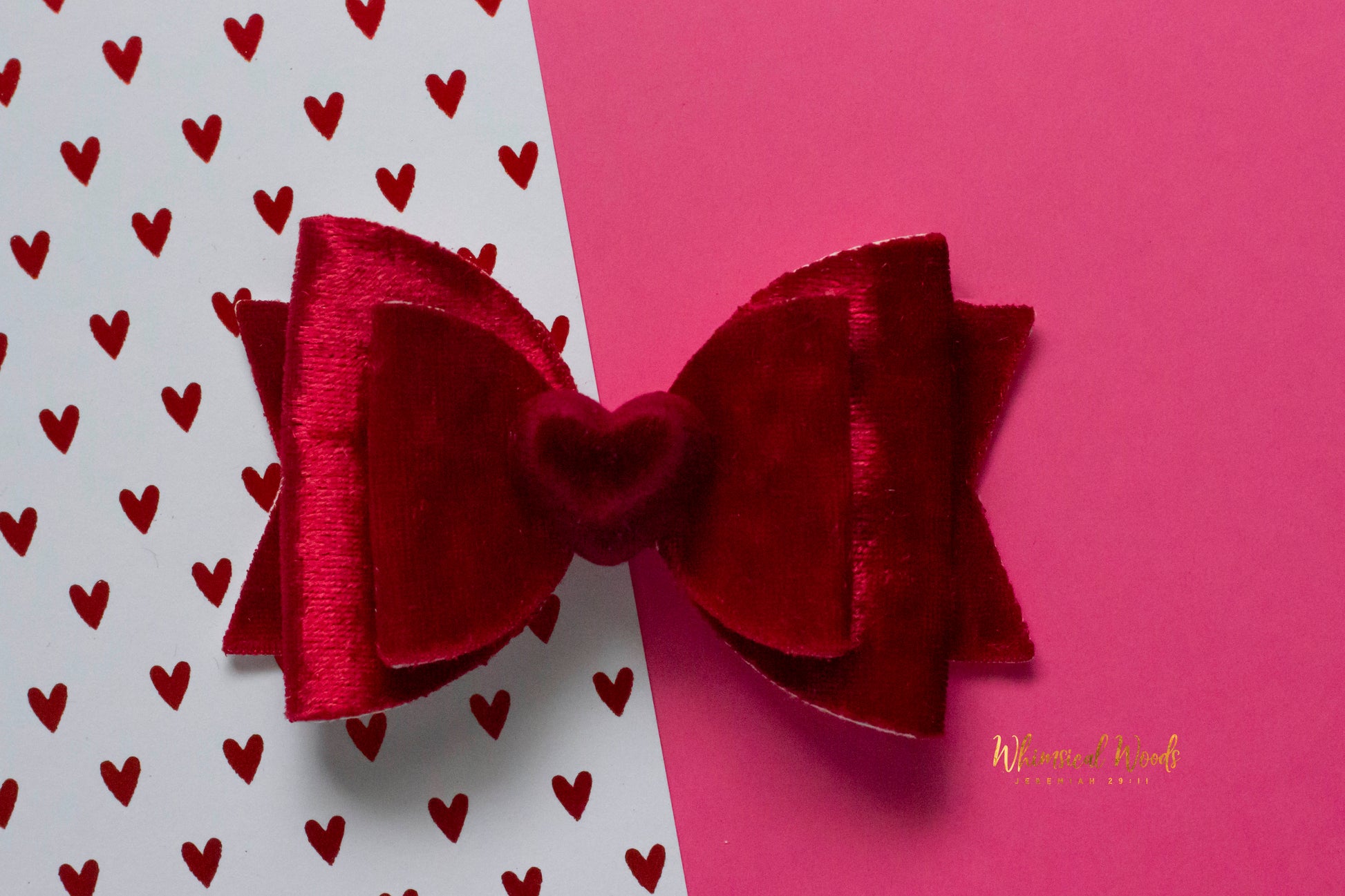 Double layer bow in vegan leather red velvet with a velvet red heart center