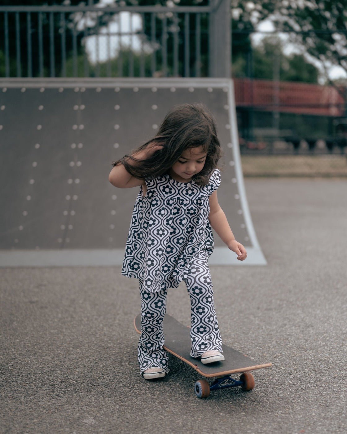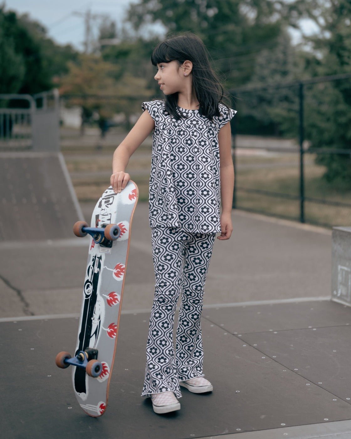 The Black and White Groovy Cap Sleeve Top blends a classic color palette with a playful, retro design, offering a fashionable yet cozy choice for your little one’s wardrobe.