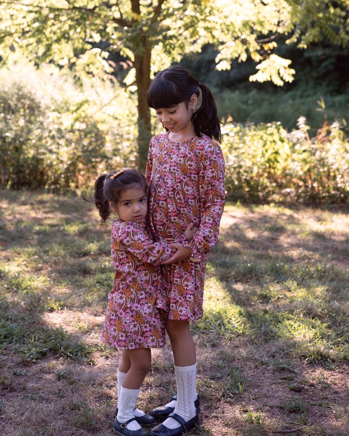 Your little girl will go for this picture perfect groovy dress over and over this fall season. This girl's dress features a beautiful vintage-inspired print in bold fall colors, a sweet seam detail on the front, and elastic at the wrists for a cute sleeve detail. We take nostalgic silhouettes and prints and bring them into modern times with our comfortable fabric. Pair this pretty dress with cozy tights and boots to complete the perfect outfit.