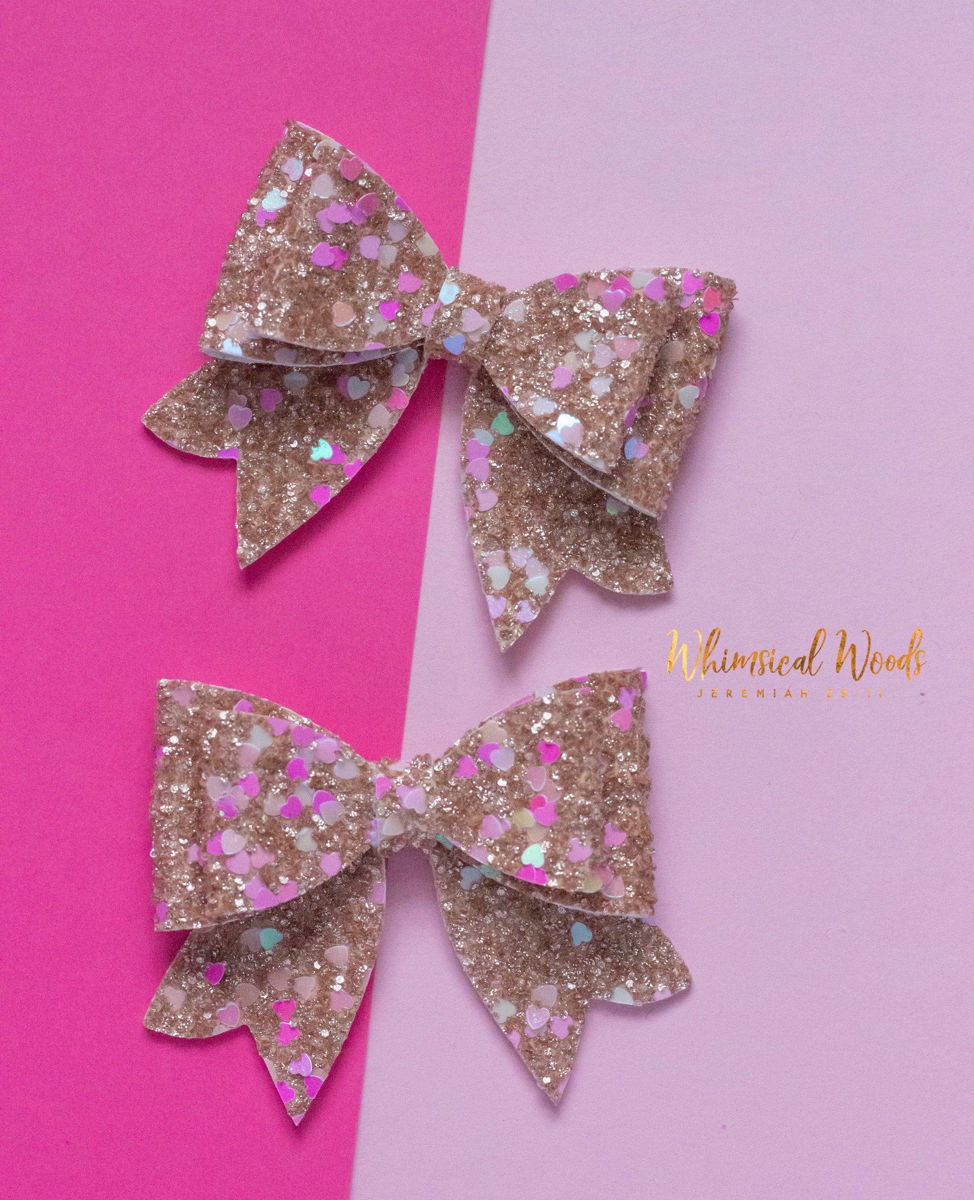 This 3" dainty bow is a double layered style in a rose gold glitter with little iridescent heart sequins