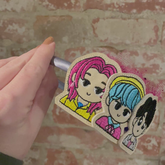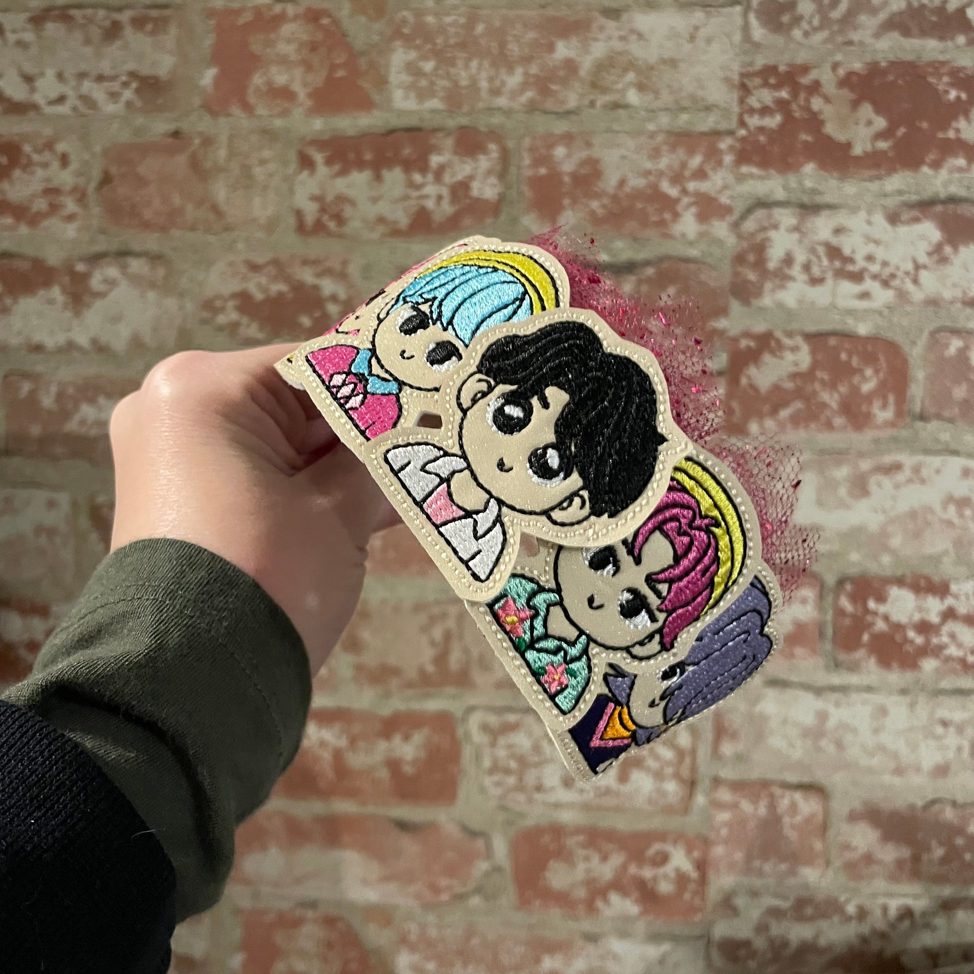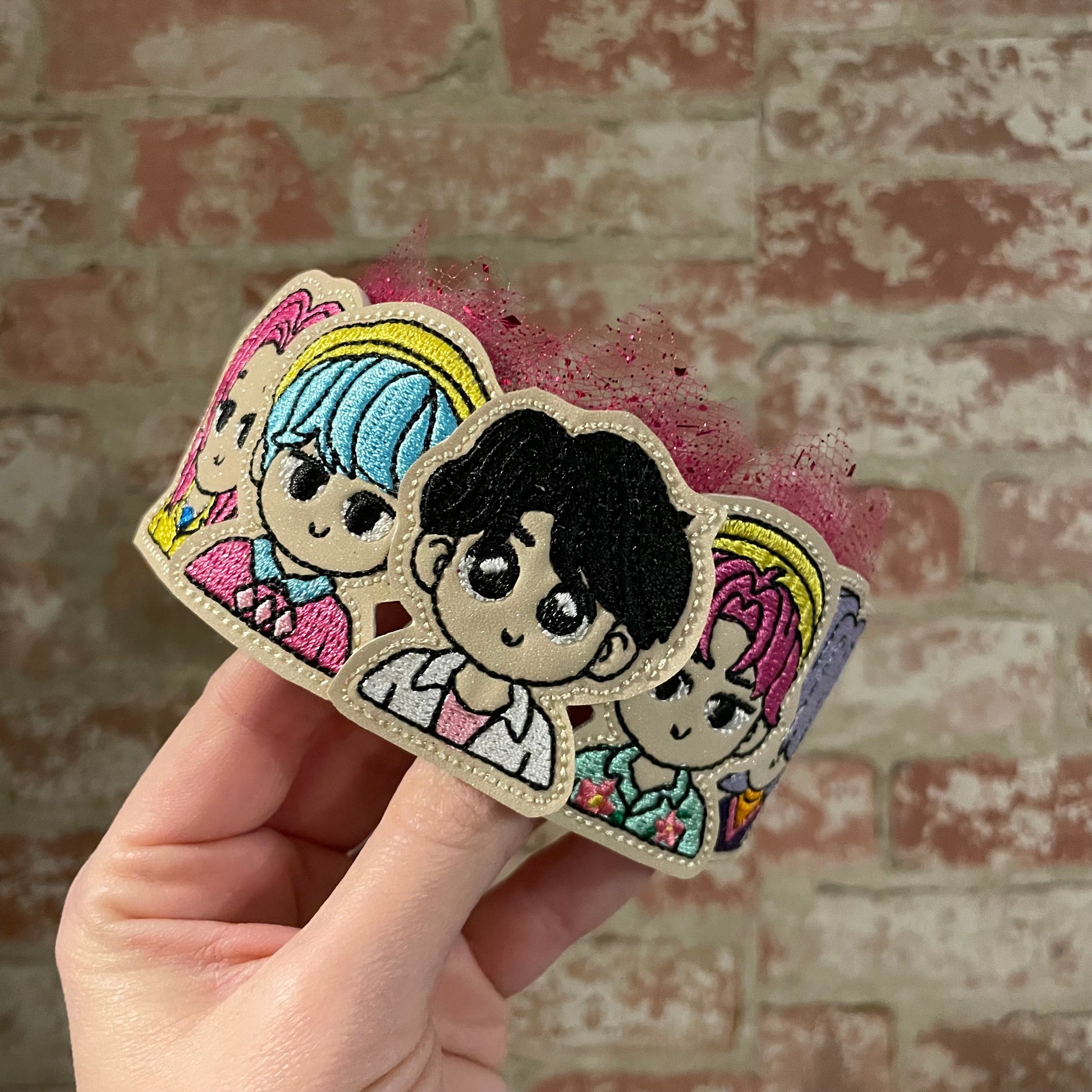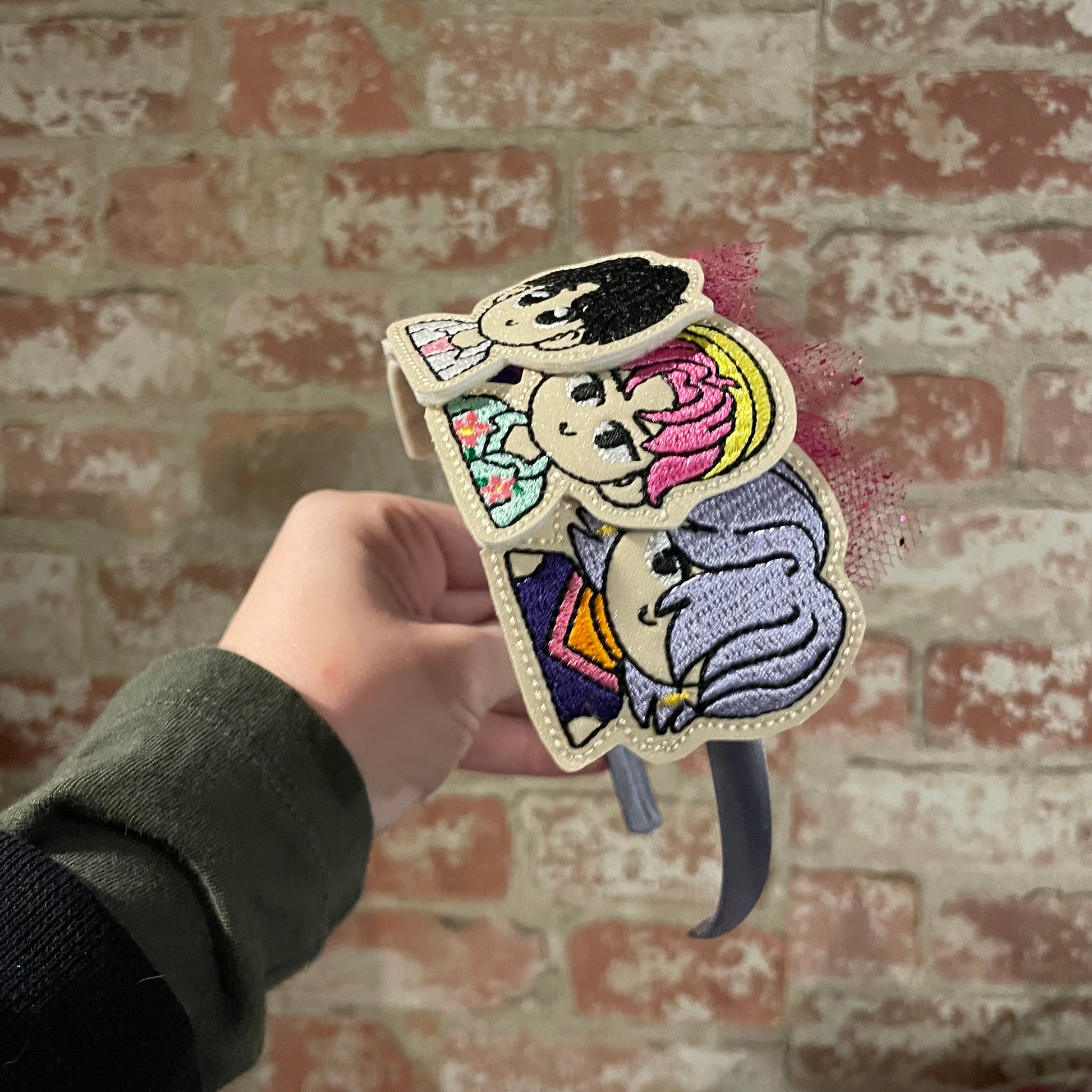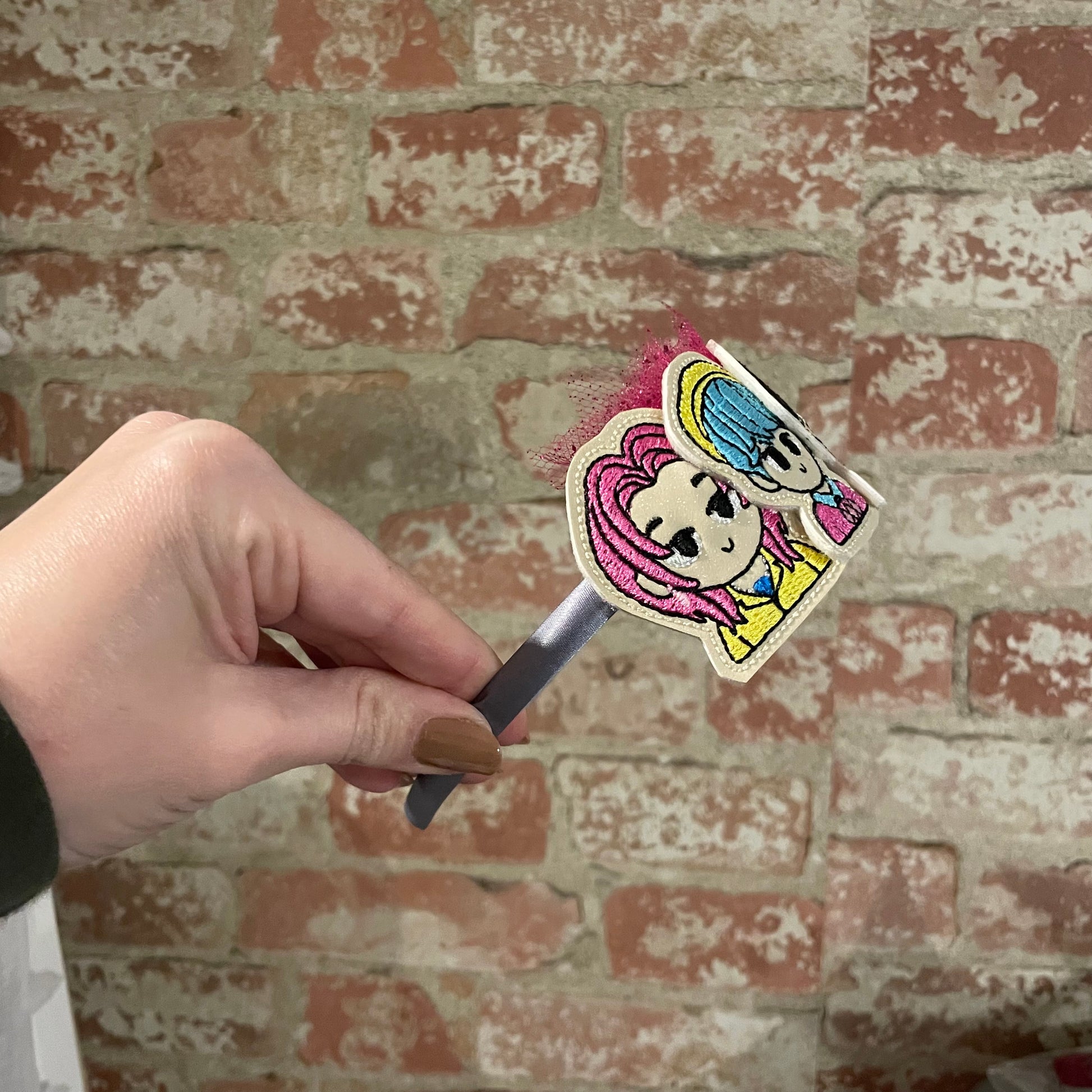 5 embroidered Felties perfectly placed together on a hard headband with tulle details and wool felt lined for comfort