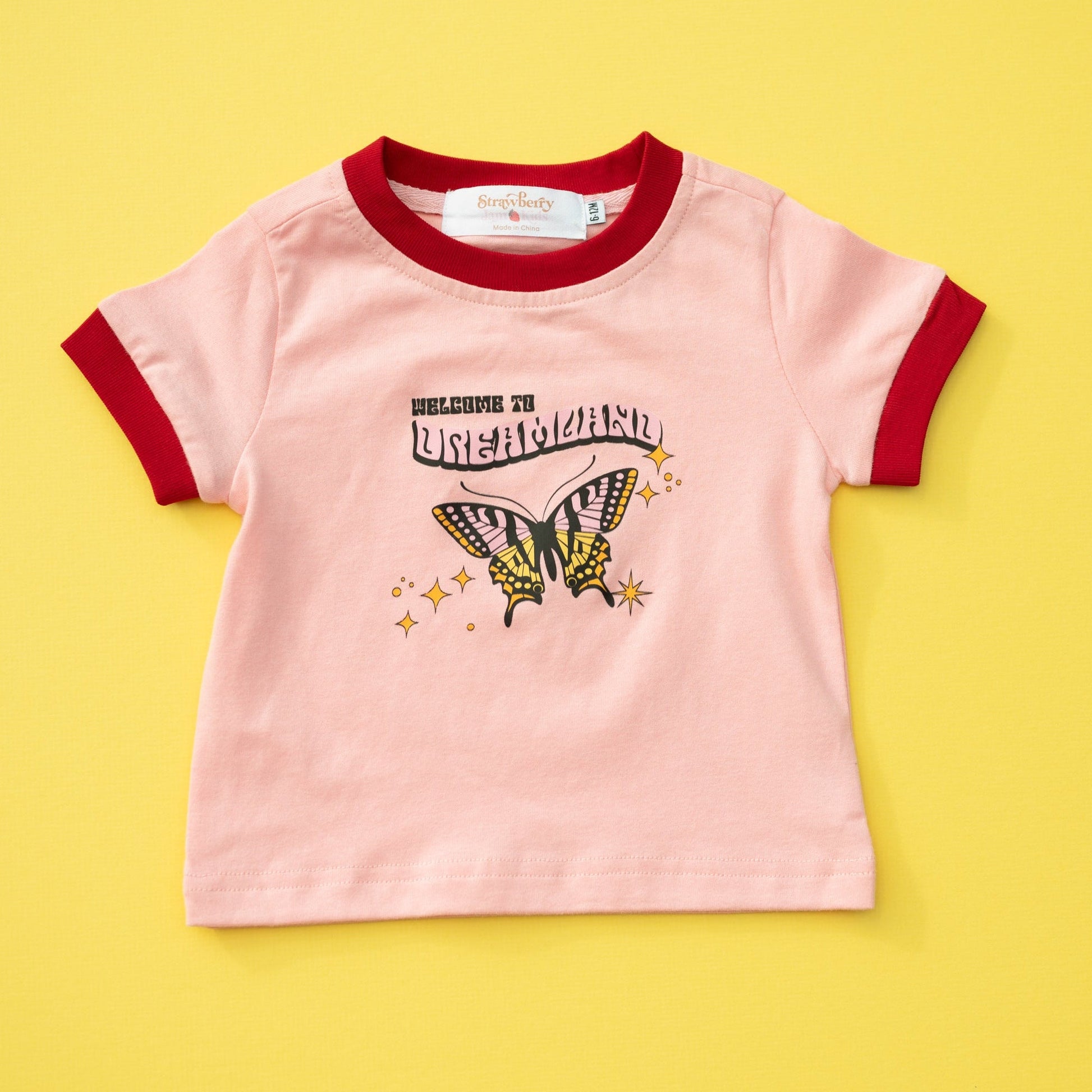 The Welcome to Dreamland Retro Ringer Tee blends vintage vibes with a timeless message, featuring a groovy butterfly design on a pink tee and contrast red trim for that classic 70s look. Made from soft, breathable fabric, it’s perfect for everyday wear—because retro vibes never goes out of style!
